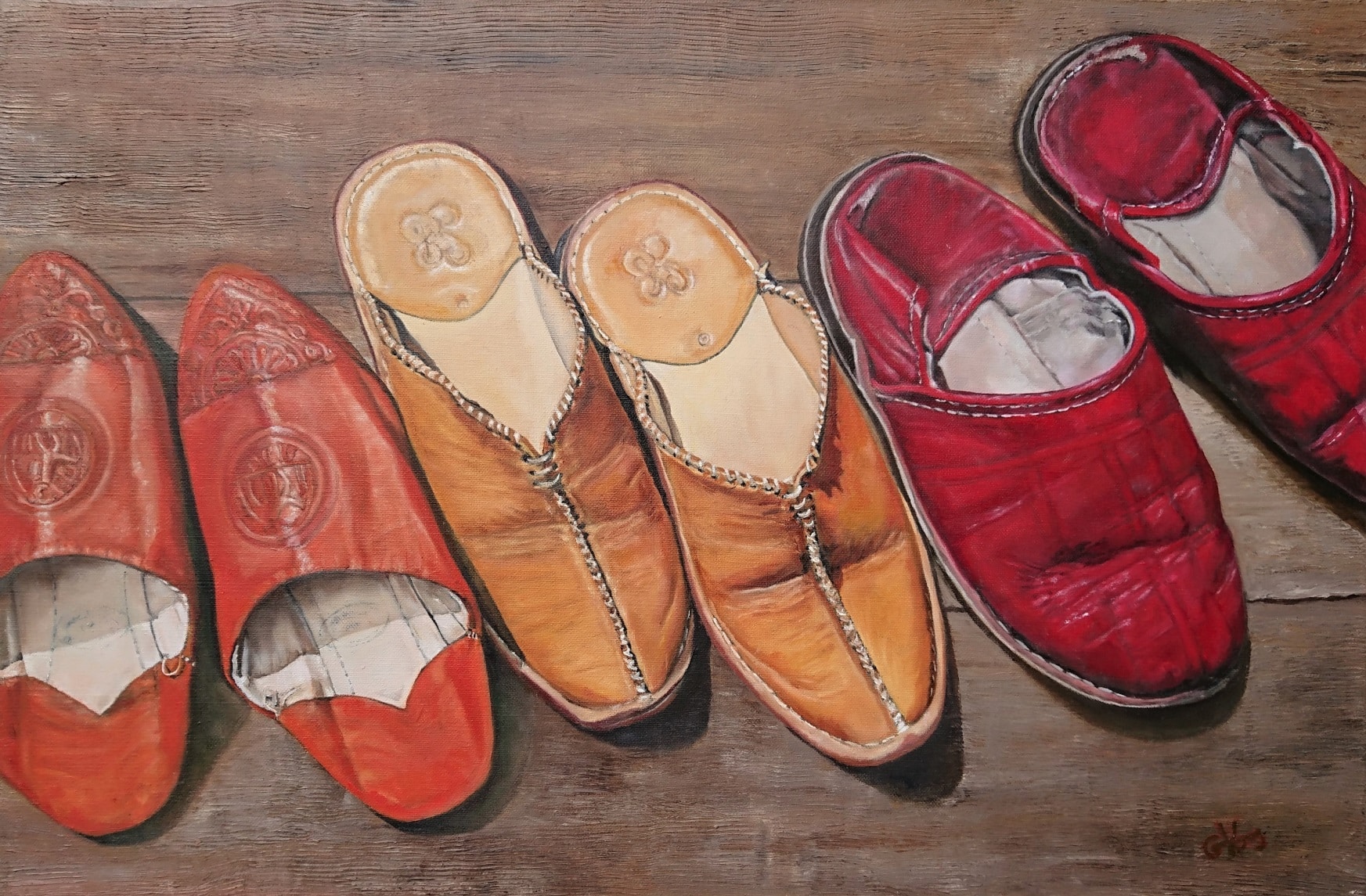 The painting depicts a typical Moroccan Babouche (slippers)